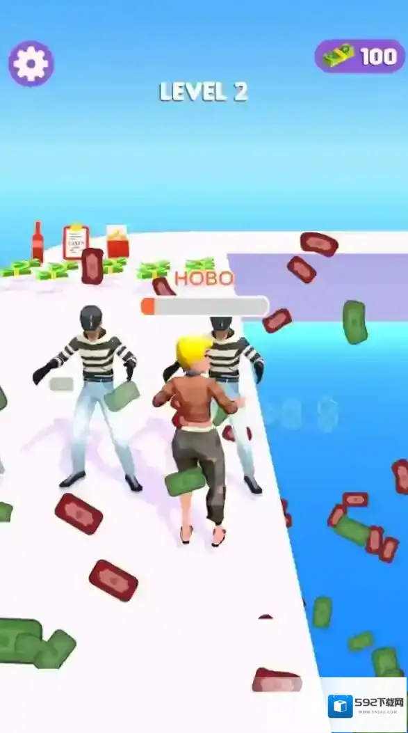 2、在LEVEL2,于满是金钱、酒瓶场景,躲避条纹衣敌人,朝着“HOBO”进度条方向,收集财富推进。
