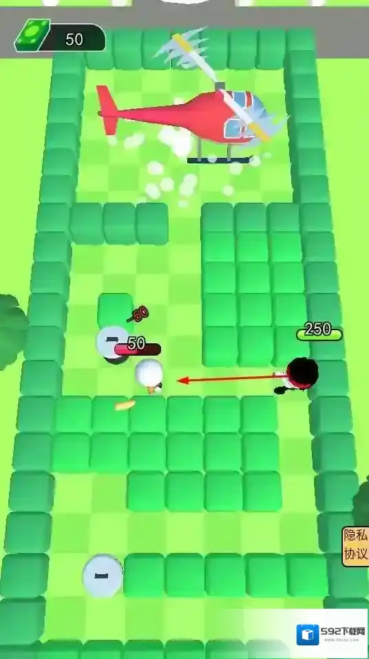 2、游戏设有关卡,玩家操控角色在绿色方块组成的迷宫场景中前进,与白色敌人战斗,向关卡终点的直升机处推进。