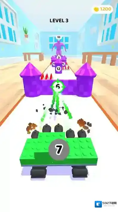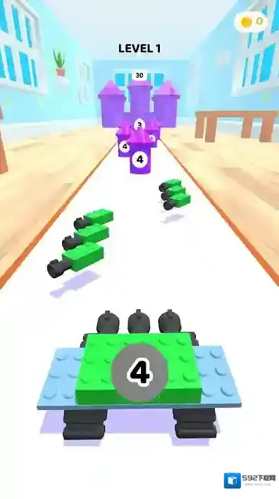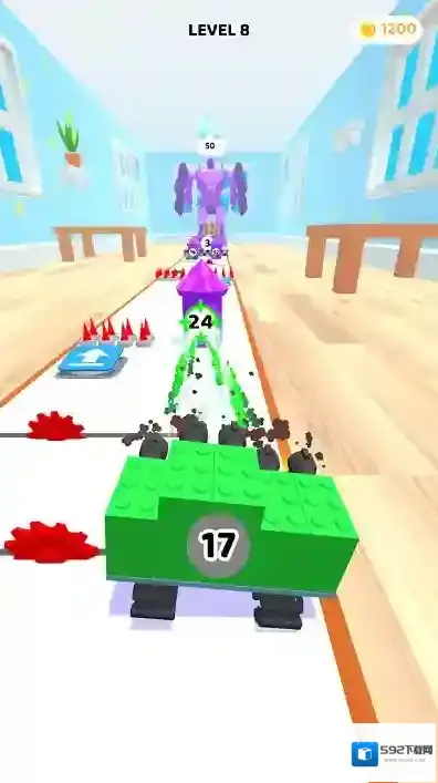 2、玩家在前进过程中收集绿色积木部件,提升战车等级,增强战车的攻击和防御能力。