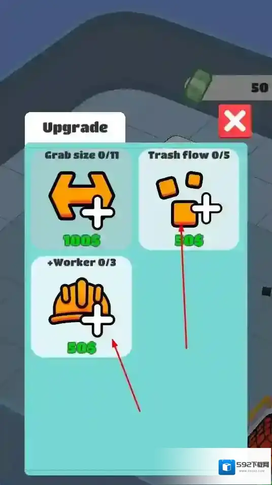 3、“升级功能”,进入升级界面,用金币提升Grabsize(抓取量)、Trashflow(垃圾流速)、Worker(工人数量),优化清理效率。