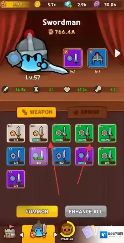 2、“装备强化”,在武器界面,选择装备(剑、头盔),消耗资源强化,增强史莱姆实力。