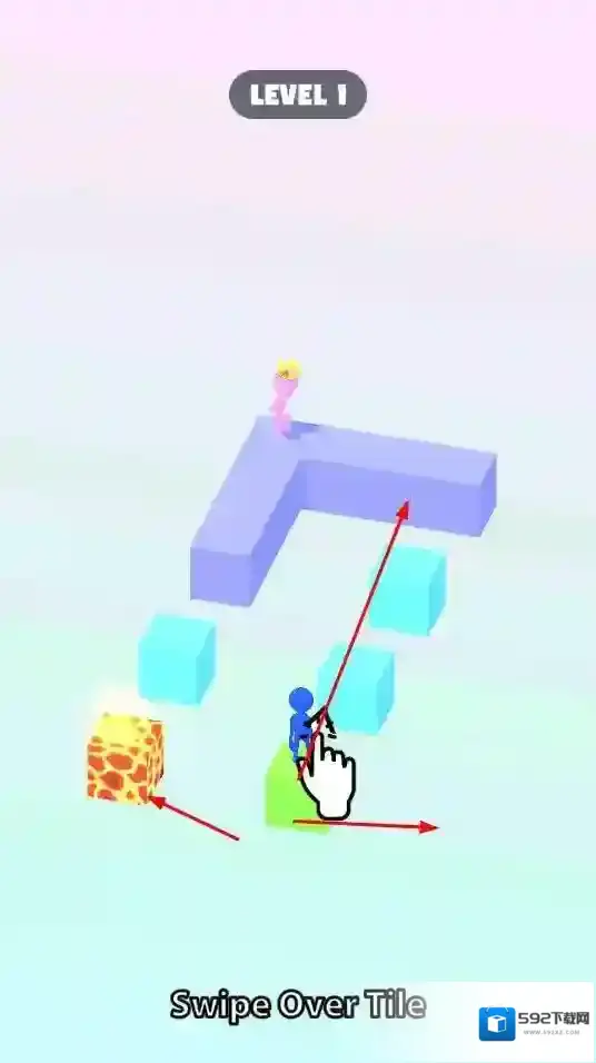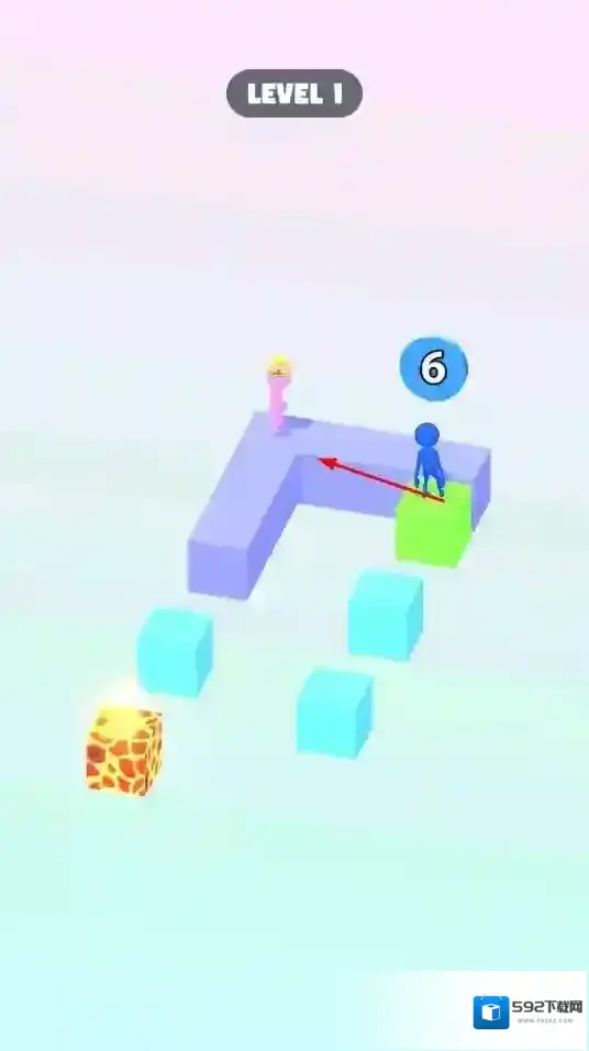 1、玩家通过滑动屏幕操控蓝色小人在方块上移动,规划路线到达目标位置。