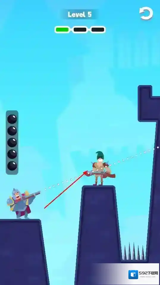 1、通过调整角度、力度,用武器弹射攻击敌人,利用物理抛物线机制,让武器命中对手,是核心战斗方式。