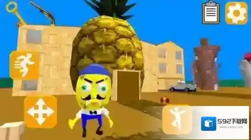 3、画面呈现比奇堡风格场景,有章鱼哥、海绵宝宝经典建筑(如菠萝屋样式等),界面有移动、奔跑、动作等操控按钮,属于海绵宝宝主题的开放世界或冒险探索类。