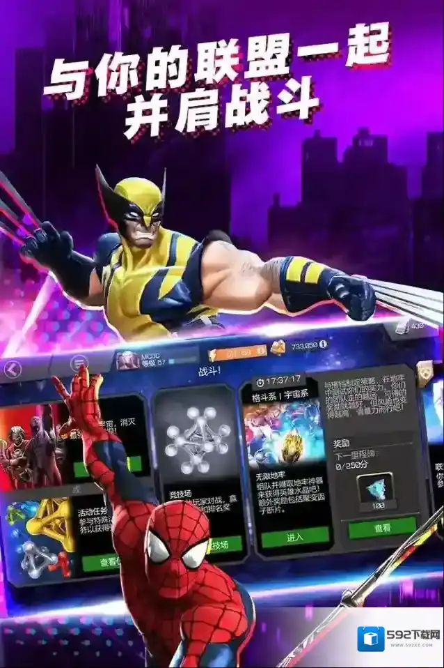 2、用英雄和反派角色来打造一支战无不胜的队伍,击败征服者康和灭霸,接受来自一位全新的神秘超级强力宇宙敌手的挑战,并最终阻止漫威宇宙的大毁灭,使用多种天赋树来强化队伍的进攻和防御能力。